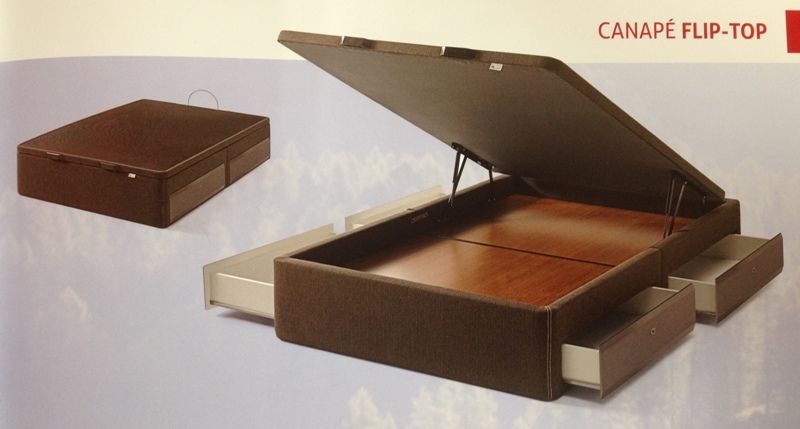 Estructura fabricada en tablero de partículas de gran resistencia. Fondo fabricado en tablero de partículas melaminado de 16mm. Tapizado con doble costura e interior a la inglesa. Tapa multiperforada para mejor transpiración. Tablero de 8mm. Tapa fabricada con estructura metálica de 30x30x1 + ángulo anticombeo de 120cm. + doble barra longitudinalen 135 y 150. una barra longitudinal en 90 y 105. Tapa perfilada. Altura total: 41cm. Capacidad interior arcón: 12cm. Hueco cajones: 19cm.